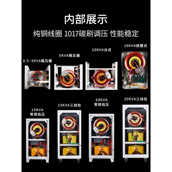 This series adopt linear integrated circuit to form the control system, drive the contact voltage regulator to regulate automatically by controlling the servo motor, it is provided with delay, over-voltage, under voltage and over-current protection function which ensure the voltage stabilizer can supply safely; It has the advantage of high efficiency, low power consumption, high accuracy of stabilization, reliable and continuous work etc., and good for in regions where the net voltage is much fluctuating!